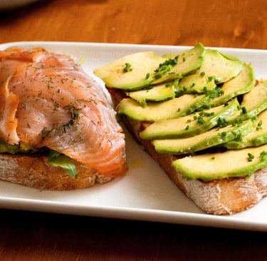 Salmón ahumado, aguacate y rúcula.