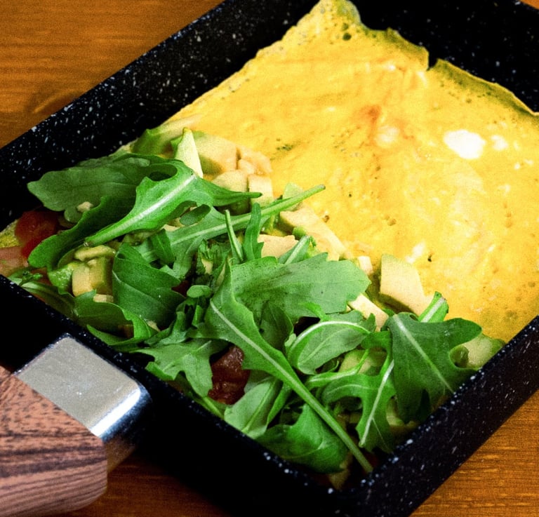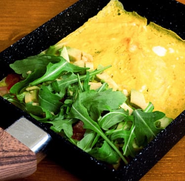 Tortilla de 2 huevos ecologicos cocinada y enrollados en sarten japo.